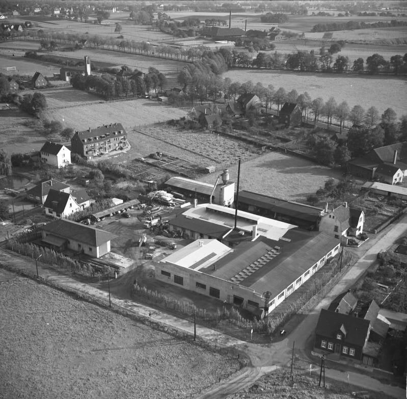 Fährstraße Greiling, dort steht heute der Aldi, das weiße Haus daneben ist heute ein Wohnhaus, damals das Büro von der Schreinerei/Bauunternehmer Friedhelm Greiling